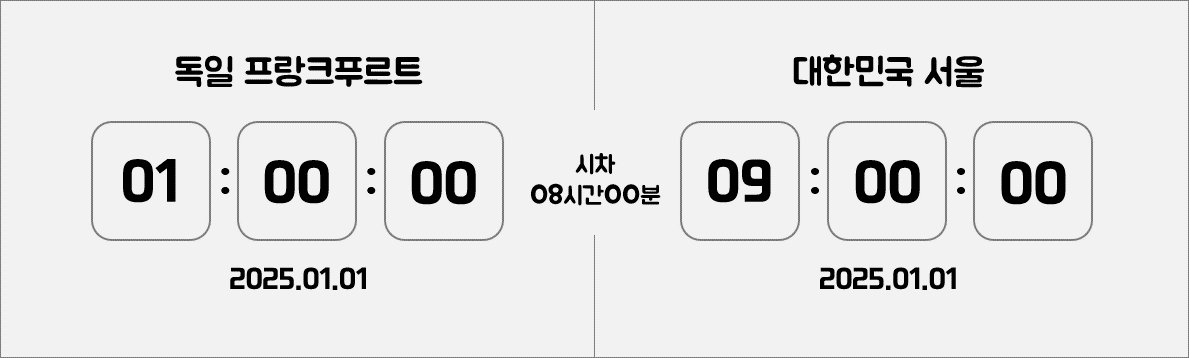 프랑크푸르트는 한국과의 시차가 8시간 차이가 납니다. 즉, 대한민국 서울에서 오전 9시일 때, 프랑크푸르트는 오전 1시가 됩니다. 하지만, 서머타임이 적용되는 기간(3월 마지막 일요일부터 10월 마지막 일요일까지)에는 1시간이 더 빨라져서 7시간 차이가 나게 됩니다. 따라서, 여행 계획을 세울 때 이 점을 유의해야 합니다.